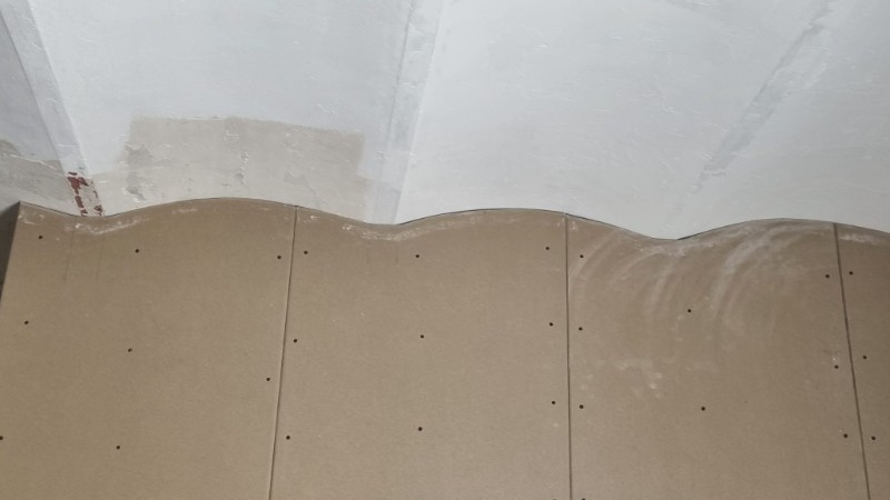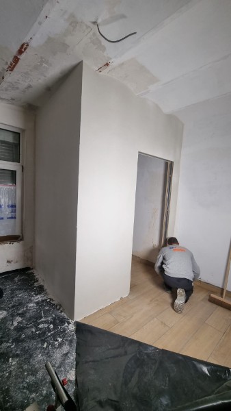 Réalisation d'un hall d'entrée à l'aide d'une cloison double face sur une ossature métallique sur laquelle sont fixés des panneaux d'OSB de 18mm ainsi que des plaques de plâtre de type gyplat , le tout plafonné à l'aide de MP75.