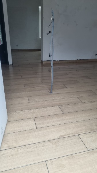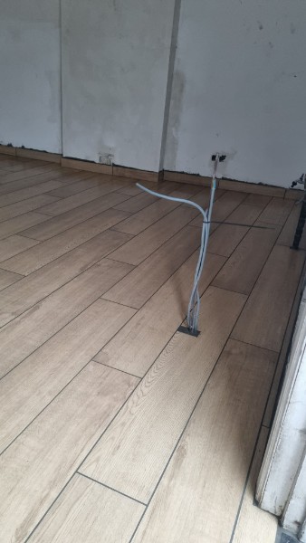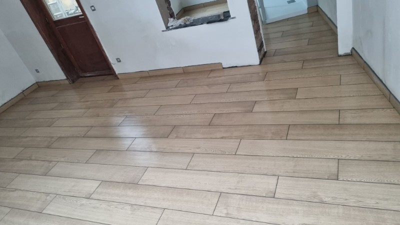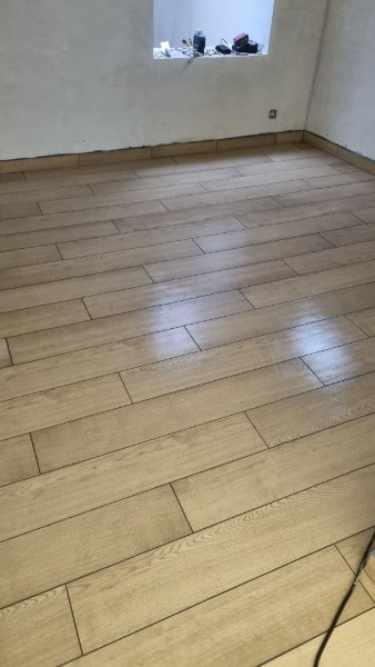 Pose du carrelage imitation parquet de dimensions 120/20cm collé à l'aide de ciment colle Flex et d'un joint gris.
