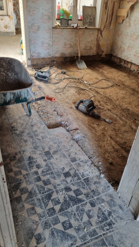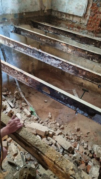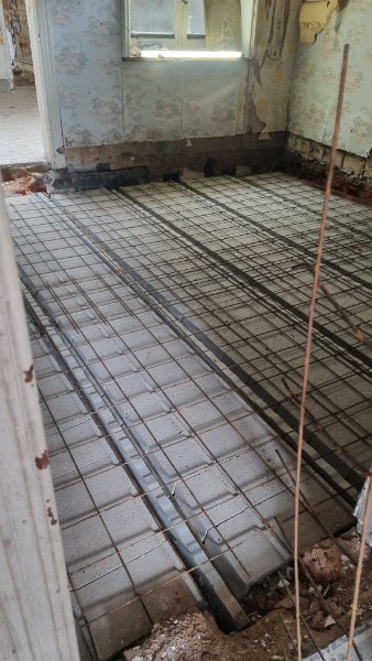 Remplacement du sol au-dessus de la cave par des poutrins et claveaux, suivi d'un ferraillage et d'une couche de compression de 7cm de béton.( Non illustré)